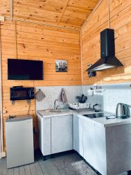 Кухня-гостиная оборудована диваном и всем необходимым для комфортного проживания (холодильник, посуда, чайник, микроволновка, плита, бакалея, телевизор в зоне гостиной)
