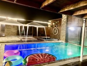 СПА, сауна на дровах,бассейн который можно переплыть под вод стеклом и оказаться на улице. Собственный пляж, волейбольная площадка, бильярдная,