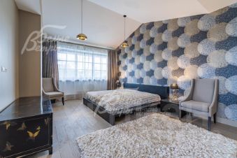 Описание внутренней отделки: выполнена дизайнерская отделка в современном стиле: комбинированная отделка стен - покраска и вставки из высококачественных обоев; на полу итальянская плитка и инженерная доска. Дубовая лестница. Двери - натуральный шпон. Потолки окрашены, разноуровневые. Встроенные шкафы и гардеробные..