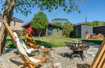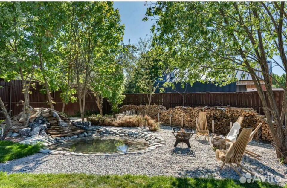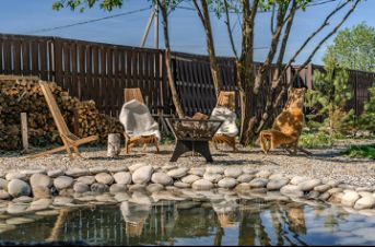 зона отдыха у кострища под лиственными деревьями с деревянными креслами с мягкими шкурками и теплыми пледами)