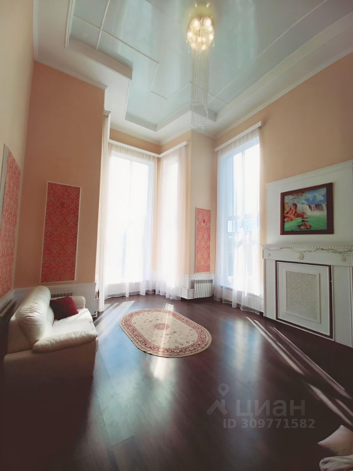 Двухэтажный 220 кв.м., зал 50 кв.м. высота потолка зала 6 м. (второй свет), люстра большая. панорамные окна высотой 4 метра. В гостиной камин и 2 дивана.