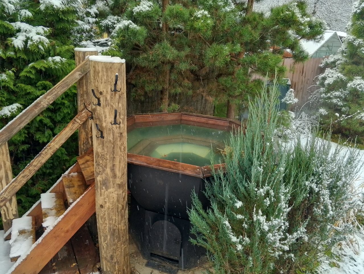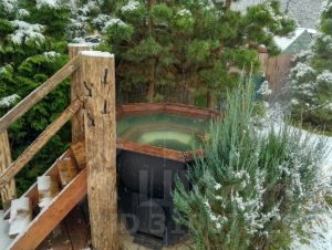 Банька представляет собой домик с кедровой парилкой, спальня, кухня-гостинная, купель внутри помещения, туалетная комната со стиральной машиной. В домике есть спальня и раскладной диван в гостиной.