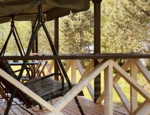 - большое крыльцо-терраса с диваном-качелями и набором мебели ;
