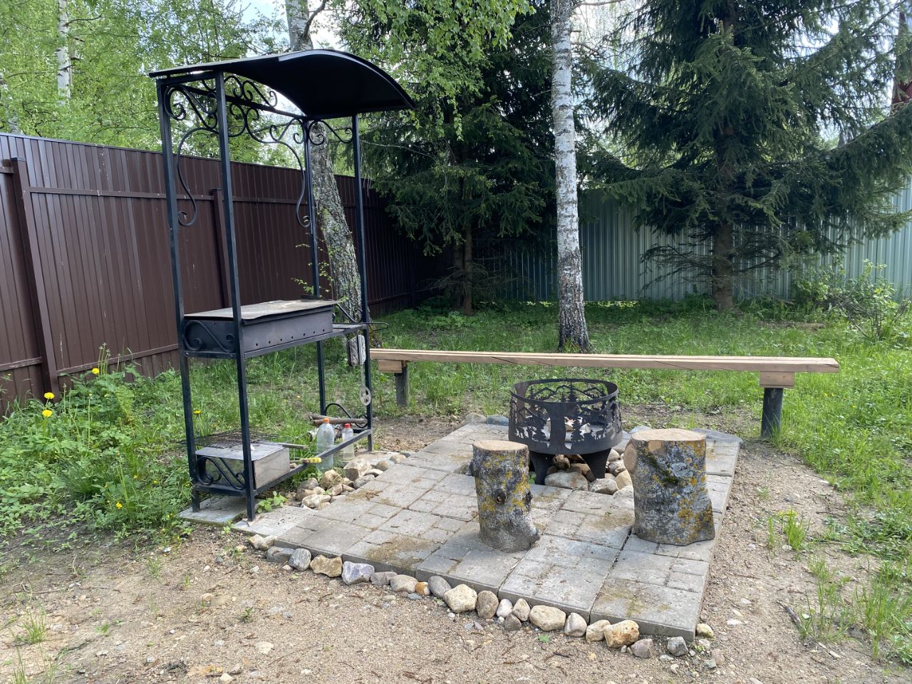 Дом построен в 2024 году, стоит у перелеска, свой выход в поле на берегу, до большой воды несколько минут пешком по живописной полевой дороге с видом на водохранилище. Участок 12 соток, огорожен высоким сплошным забором, на участке растут сосны, ели и берёзы. У дома большая лужайка. Среди елей и берез расположена зона барбекю с мангалом, барбекю и костровой чашей.