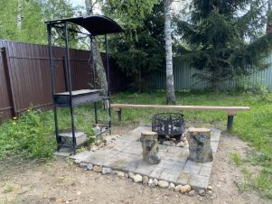 Зона для барбекю с мангалом, барбекю и костровой чашей.