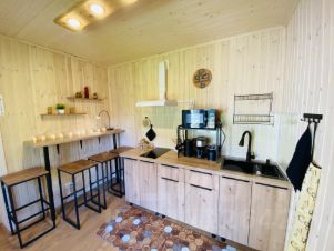 - кухня с барной стойкой, варочной панелью, микроволновкой, чайником, кофеваркой, тостером, большим холодильником, набором посуды ;