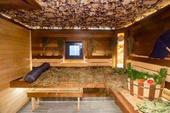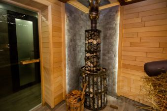 Настоящая русская баня на дровах: парная 6 м² из липы, можжевельника с панно из целебной гималайской соли (оплачивается отдельно).