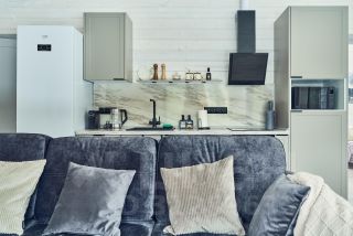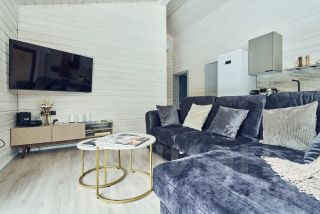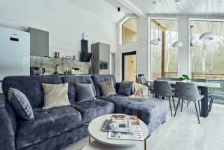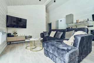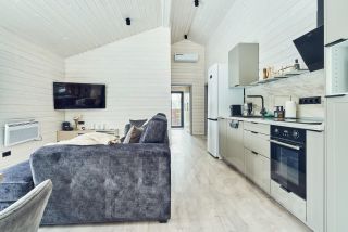 - прoсторная кухня- гоcтиная c шикaрной панорамой и диваном на 2 спальных места;
