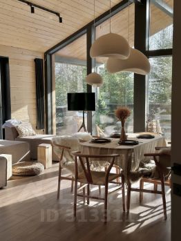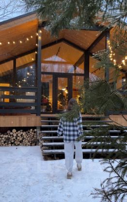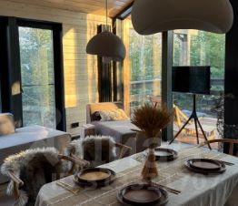 Новый панорамный барнхаус c сауной и купелью в окружении хвойных деревьев.