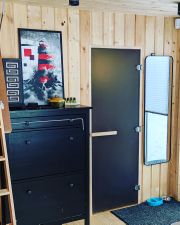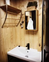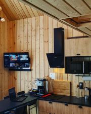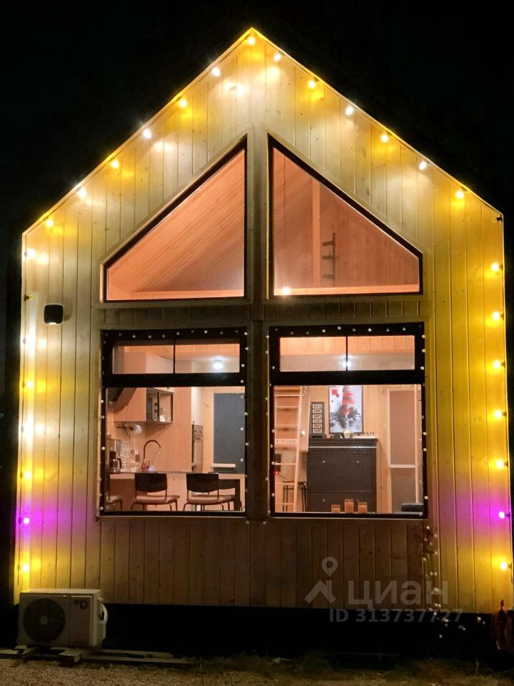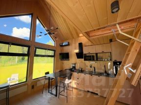 Дом состоит из просторной кухни- столовой с панорамными окнами, с большим диваном (2 спальных места), полностью оборудованной кухней, а также мансардного этажа с кроватью 140*200 с матрасом средней жесткости.