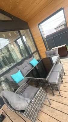 Большая уютная гостиная совмещенная с кухней, с огромными панорамными окнами с выходом на террасу, выход к чану, беседке и мангалу.