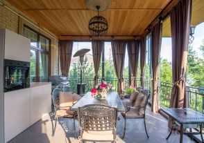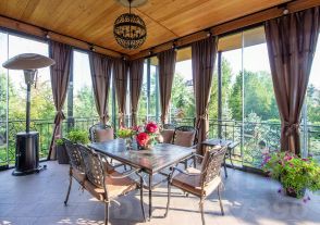 1-ый уровень: впечатляющий холл с высотой потолков 8 метров, элегантная гостиная с камином, кухня, просторная столовая, кабинет (может использоваться как дополнительная спальня), терраса / зимний сад, домашний кинотеатр, гардеробная, постирочная, гостевой с/у.