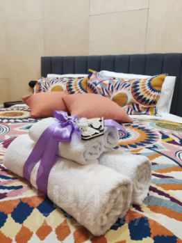 1 двуспальная и 2 односпальные кровати, диван раздвижной, стол на 10 человек, встроенная техника, санузел с душевой, стиралкой, гардеробная, посуда, чистое белье, банные халаты и полотенца, также мыльные принадлежности.