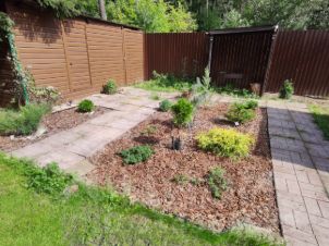 На участке газон с ландшафтным дизайном, вишня, жимолость, сортовая малина.