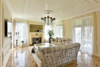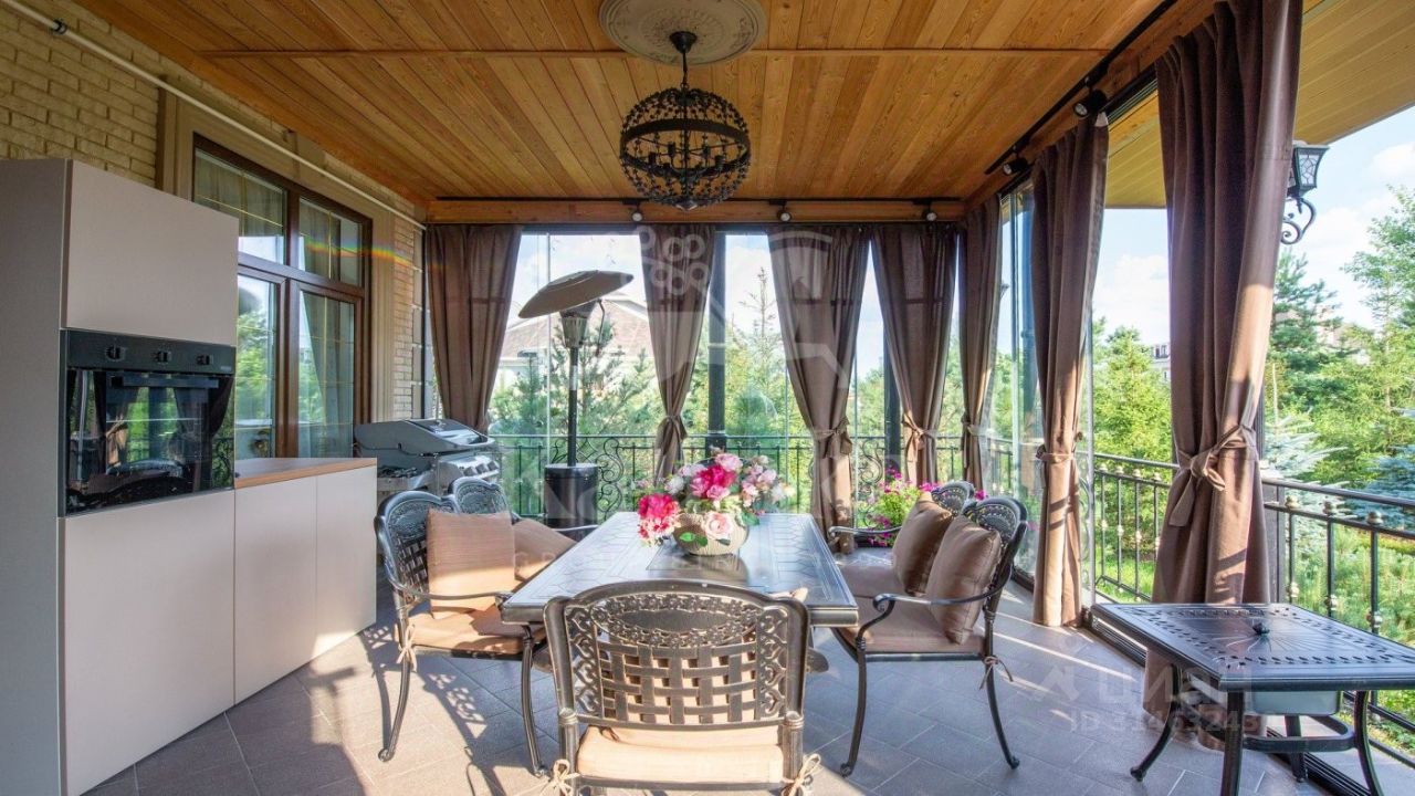 1 этаж: холл, потолки 8 метров, гостиная с камином, кухня, просторная столовая, кабинет (может использоваться, как спальня), терраса/зимний сад, домашний кинотеатр, гардеробная, постирочная, гостевой с/у.