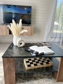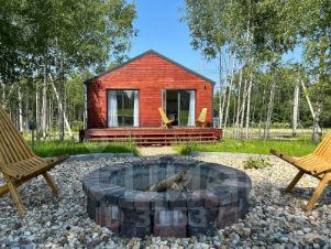 • В доме 2 спальни (двуспальная и две односпальные кровати), кухня-гостиная (диван раскладной) и один санузел