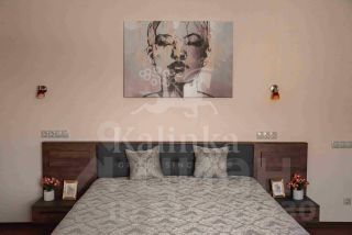 Четыре спальни, три санузла, второй свет в гостиной, в которой находится зона ТВ и дровяной камин. Кухня оборудована итальянской мебелью и всей необходимой техникой: посудомоечная машина, холодильник, варочная панель, духовка, СВЧ. Имеется сауна, гардеробная, постирочная, большая кладовая. В коттедже имеется роскошная веранда (23 кв. м), и два больших балкона (23 и 19 кв. м). Эксплуатируемые чердачные помещения площадью 70 кв м.