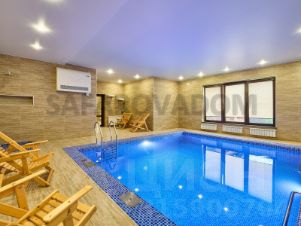 - Теплый бассейн ( 4,5 * 4,5 м , глубина 1,6 м. ) Вода чистая и безопасная , т. к. проходит через системы механической и химической очистки