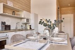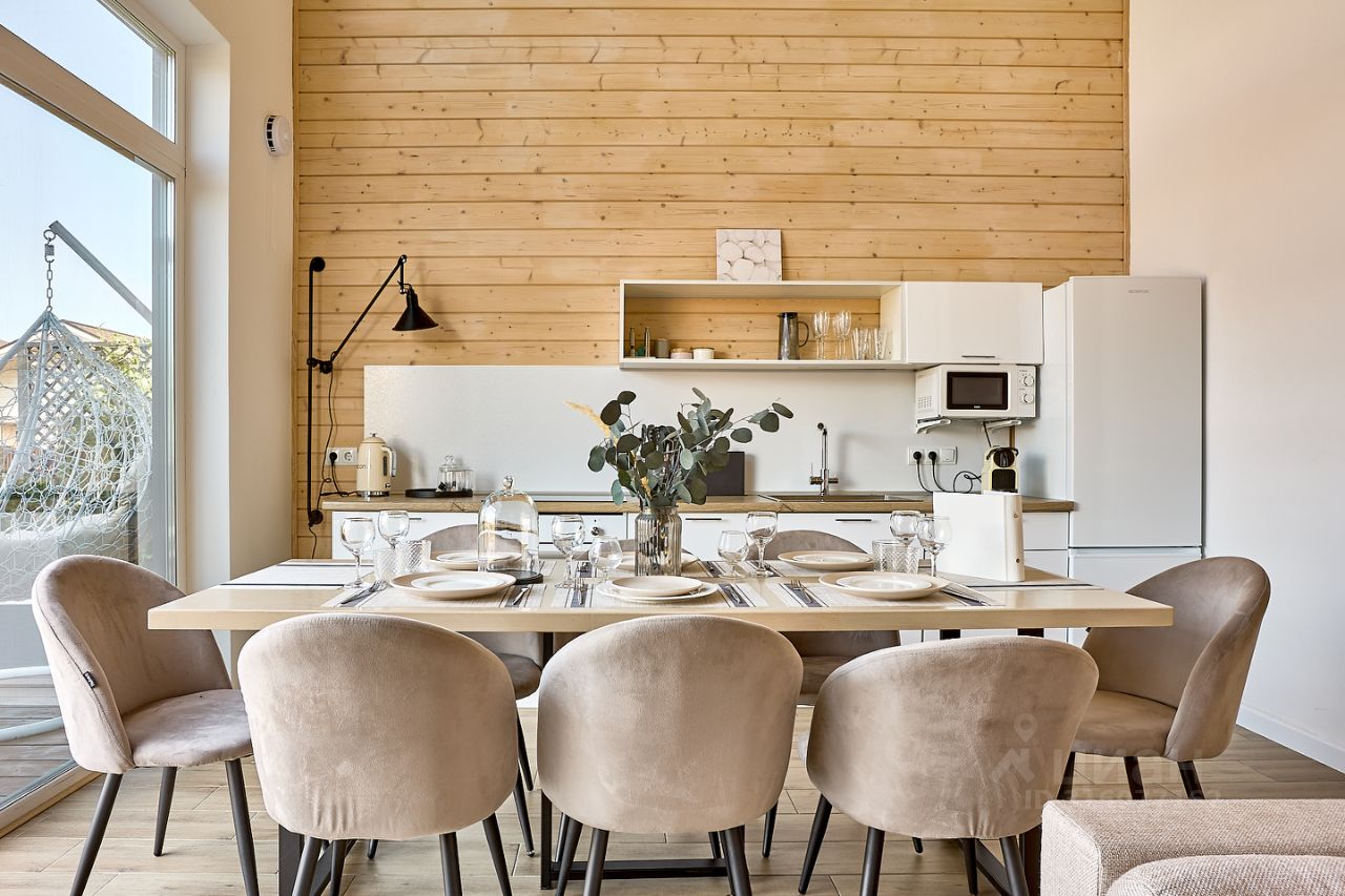Кухня-гостиная с панорамными окнами — много света, уютный интерьер, большая обеденная зона, вся необходимая техника.
