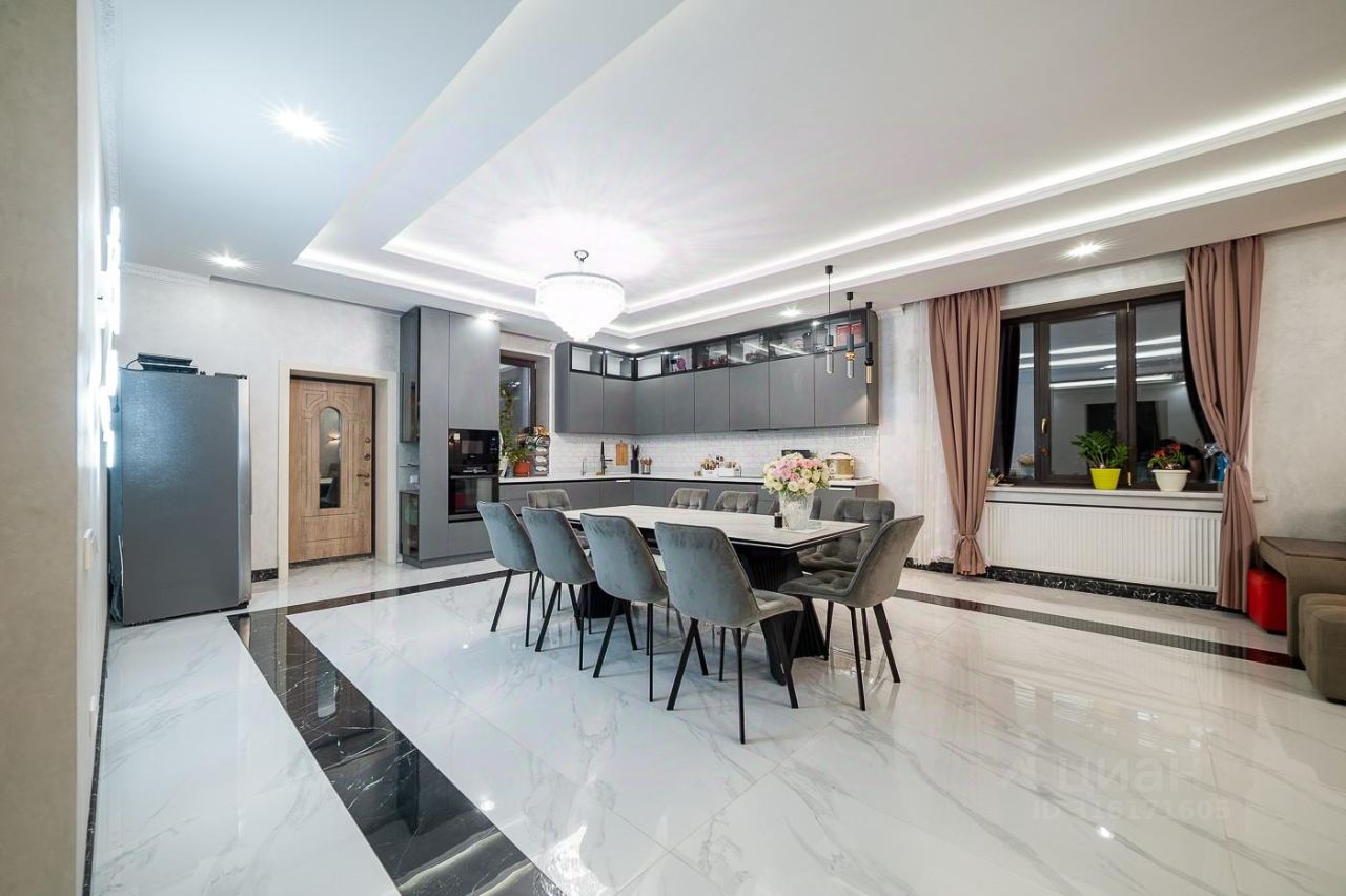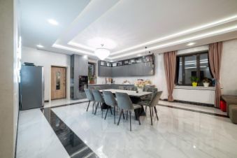 на первом этаже кухня-гостиная площадью 72 м2, для проведения банкетов на 18 персон.