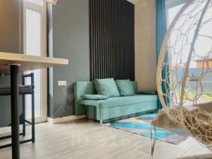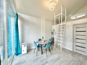 На территории 2 домика: тёплый оранжевый и освежающий бирюзовый — каждый с собственной зоной отдыха.