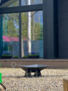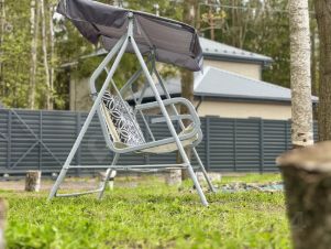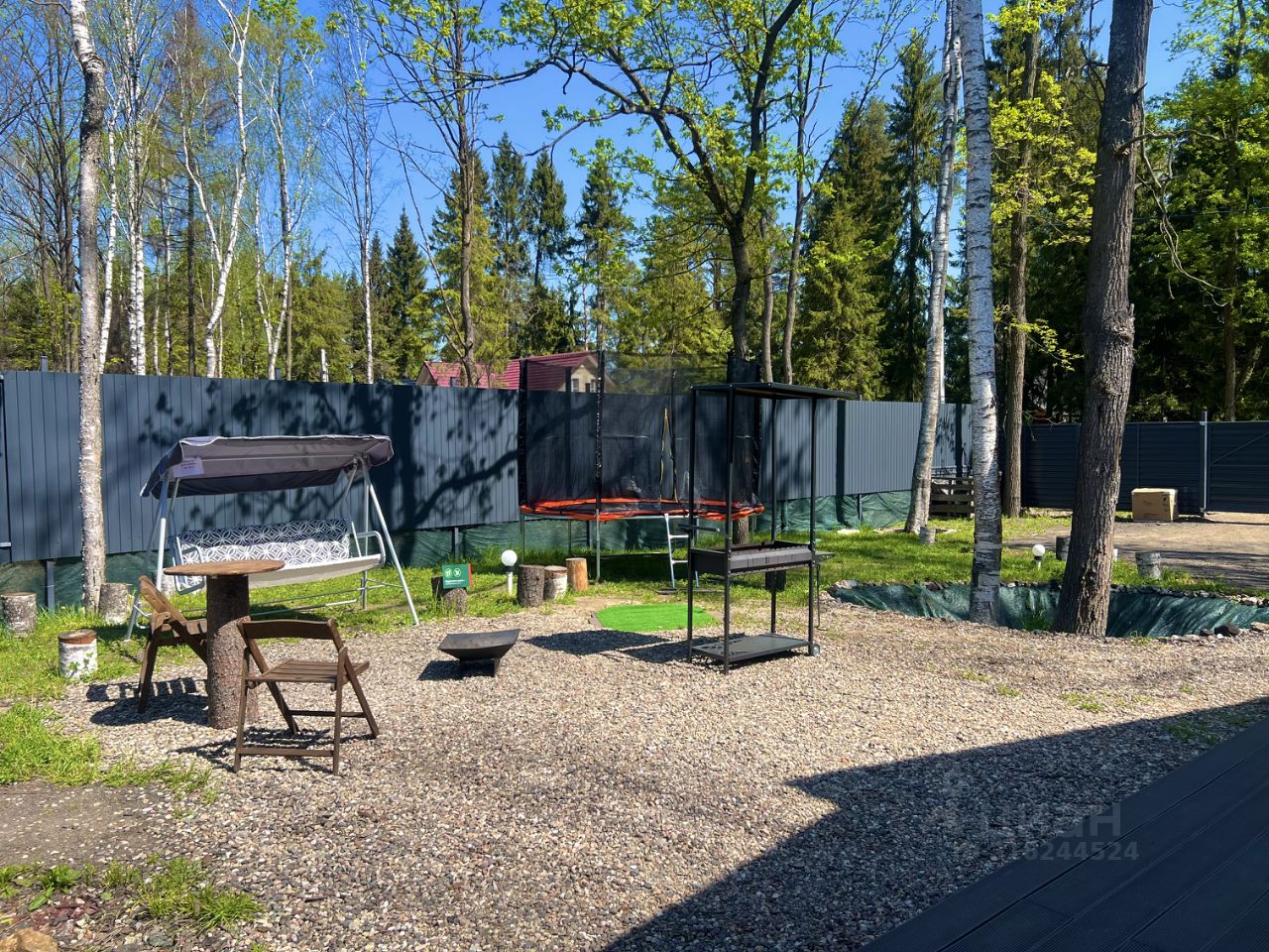 Мангал с навесом, шампуры, решётка, костровая чаша с креслами, качели, батут.