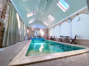 В отдельностоящем здании: бассейн подогреваемый 8х3, русская баня на дровах (парилка на 6 чел), гардеробная, санузел, душ, комната отдыха с ТВ.