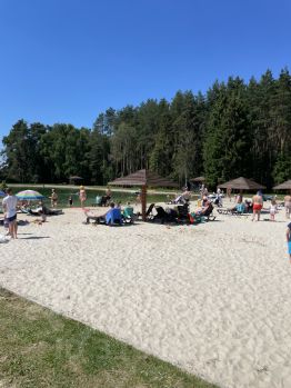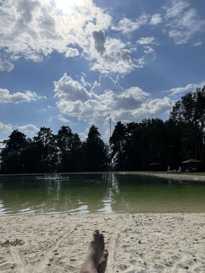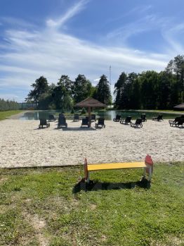 Если вкратце: охраняемая, закрытая территория с видеонаблюдением, 2 детские площадки, 1 спортивная площадка, 4 поля (футбол, волейбол, баскетбол и теннис) оборудование озеро с пляжем и шезлонгами (есть на фото), беседки на берегу озера, а так же подземный источник, все это в окружении леса.