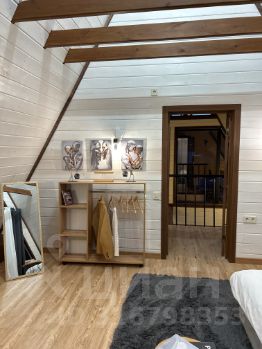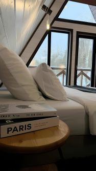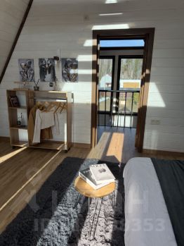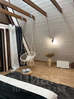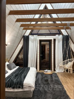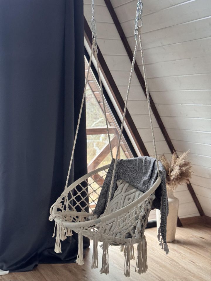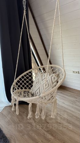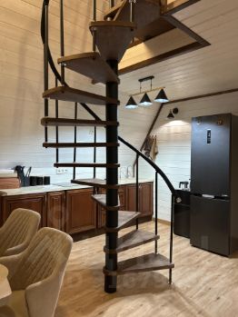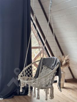 На второй этаж ведет винтовая лестница. Здесь отдельная просторная спальная комната с выходом на балкон ( подвесное кресло, на балконе два пуфика ), а так же санузел ( туалет и раковина)
