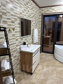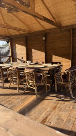 При входе в дом, имеется не большая терраса с уличной мебелью ( стол и кресла ), дорожка к дому выложена брусчаткой. На территории участка есть зона для разжигания костра ( прилагаются деревянные стулья со спинкой ), зона с беседкой ( большой стол, стулья, освещается, есть мягкие окна ), и мангальная зона