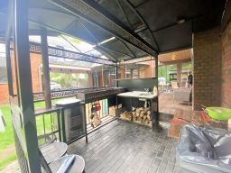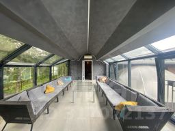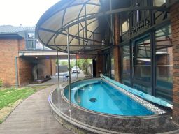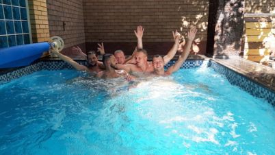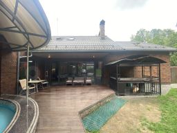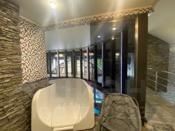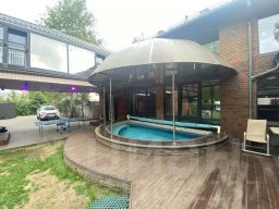 Бассейн 6*12м, часть которого выходит на территорию участка разделяющего запорной балкой. Внутри основного бассейна джакузи с горячей водой.