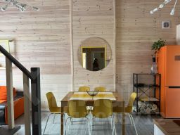- Гостиная cовмещеннaя c кухней (раскладной диван, стол и стулья до 8 гостей, чайник, кофеварка, микроволновка, варочная панель, духовка, холодильник, посудомоечная машина, ледогенератор, большой набор посуды)