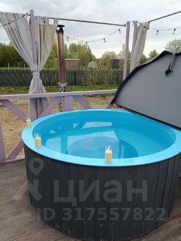 В террасу вмонтирована подогреваемая купель, тут же вход в баньку на дровах.