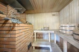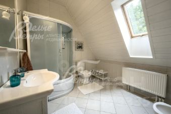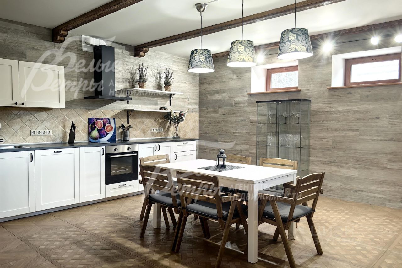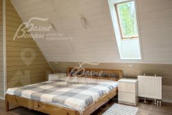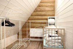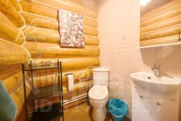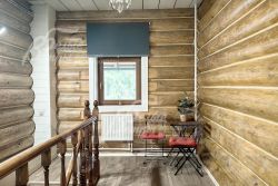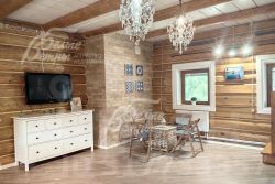 Описание внутренней отделки: отделка в современном стиле минимализма: стены бревенчатые, окрашены; в санузлах плитка; на полах ламинат, в гостиной и в цокольном этаже - плитка; потолки отделаны деревом. Лестница шириной 90 см из массива сосны с деревянными перилами..