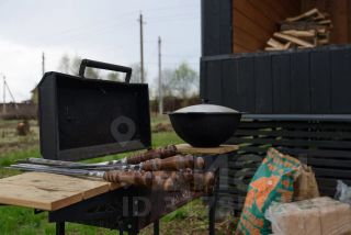 -Мангал с шампурами и большой казан на 8 литров для приготовления ароматных блюд на открытом воздухе.