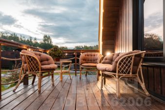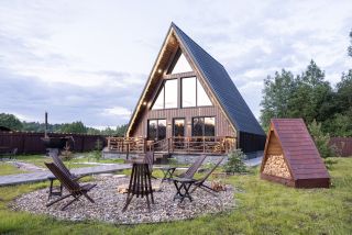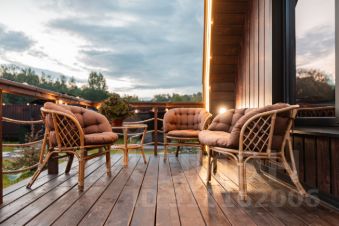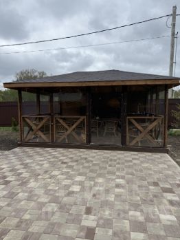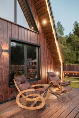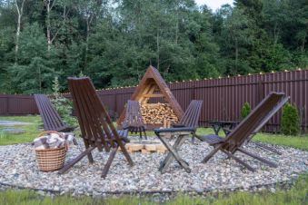 При входе в дом, имеется не большая терраса с уличной мебелью ( стол и кресла ), дорожка к дому выложена брусчаткой. На территории участка есть зона для разжигания костра ( прилагаются деревянные стулья со спинкой ), зона с беседкой ( большой стол, стулья, освещается, есть мягкие окна ), и мангальная зона