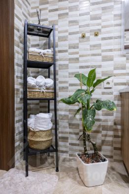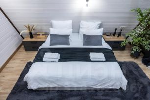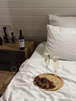 Гостиная с большим диваном и умным телевизором (Яндекс Алиса) совмещена с кухней (имеется кран с питьевой водой, холодильник и морозилка, посуда, столовые приборы и тд.), отдельная комната со спальней (двуспальная кровать), а так же санузел совмещенный(ванная, раковина, туалет, средства гигиены, одноразовые принадлежности) .
