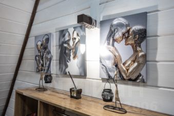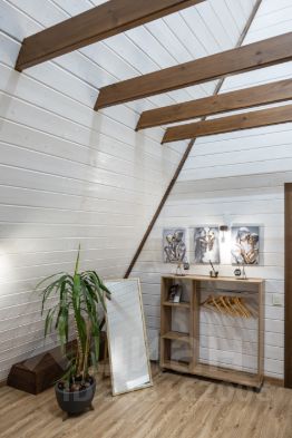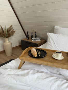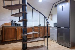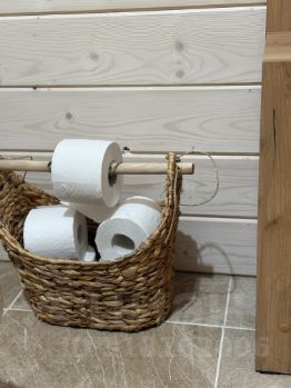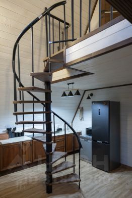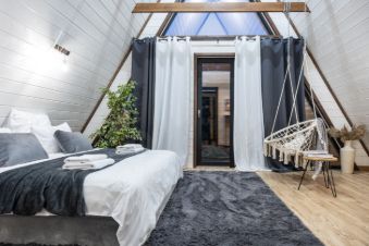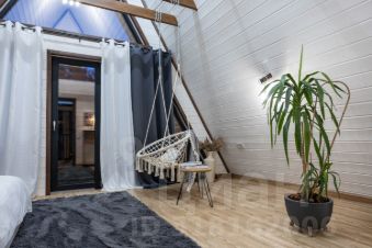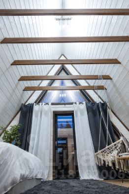 На второй этаж ведет винтовая лестница. Здесь отдельная просторная спальная комната с выходом на балкон ( подвесное кресло, на балконе два пуфика ), а так же санузел ( туалет и раковина)