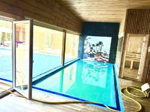 Большая сауна с видом на бассейн — сразу можно нырнуть в теплую воду!