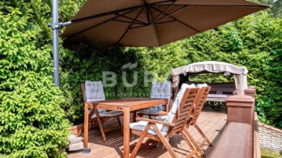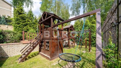 Ухоженный участок с ландшафтным дизайном утопает в зелени. Сделаны дорожки, высажено много деревьев и кустарников. Организована зона для отдыха на свежем воздухе с садовой мебелью. Построена детская деревянная площадка с качелями.