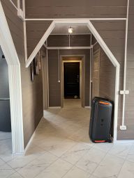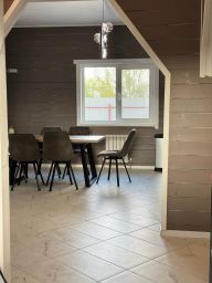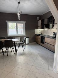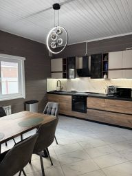 Просторная кухня , оборудованная всей необходимой техникой (варочная панель, микроволновая печь, чайник , холодильник , посудомойка , кофемашина), набором кухонных принадлежностей и комплектом посуды.
