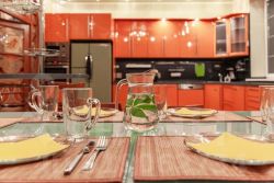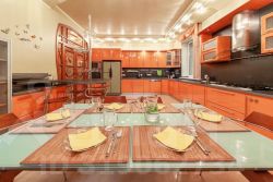 - На 1м этаже расположена просторная гостиная, оборудованная угловым диваном, банкетным залом, кухня-столовая