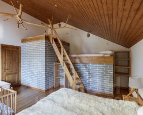 На 2 этаже: 6 спален, четыре спальни имеют двуспальные кровати и собственные ванные комнаты, возможна установка дополнительной или детской кровати. Две другие спальни позволяют разместить до 4 человек в каждой. Все кровати имеют ортопедические матрасы, подушки, одеяла, постельное белье застилается к вашему приезду, каждому гостю предоставляются тапочки, комплект полотенец и душевые принадлежности. В спальнях шкафы из кедра для одежды, тумбы, удобные розетки у кроватей.