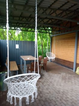 > *. Есть вся необходимая посуда и для кухни и для шашлычной зоны,также есть микроволновка,электрическая плита , холодильник, электрический чайник.