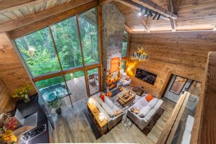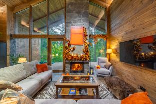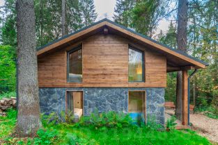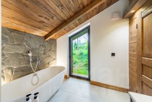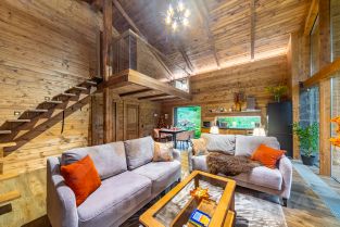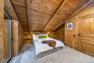 Фасад дома выполнен из натурального камня и дерева, а панорамные окна добавляют легкости и света. В интерьере — сочетание современного минимализма и альпийского уюта: деревянные потолки, каменные элементы, стильная мебель и продуманная детализация.
