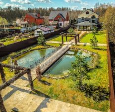 Участок в 13 соток покрыт газоном, растут плодовые деревья кустарники, есть крытое барбекю с казаном, мангалом и грилем.
