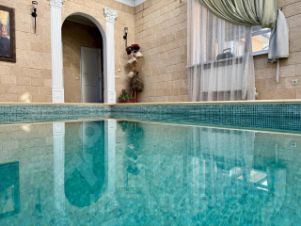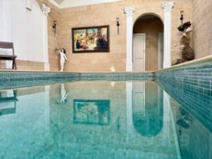 В отдельностоящем здании: бассейн подогреваемый 8х3, русская баня на дровах (парилка на 6 чел), гардеробная, санузел, душ, комната отдыха с ТВ.
