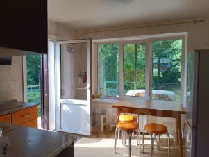 Баня на дровах. Просторный гараж. Место для парковки на несколько машин. Большой участок. Оборудованное место для шашлыков. Веранда с видом на лес.