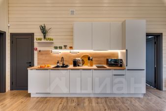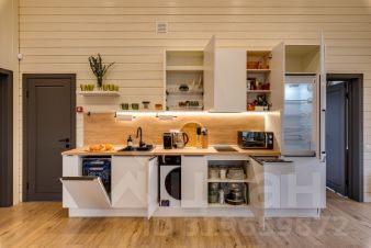 В зоне гостиной есть обеденный стол и вся необходимая посуда, холодильник, микроволновая печь, варочная панель, духовой шкаф, посудомойка, чайник и диван.