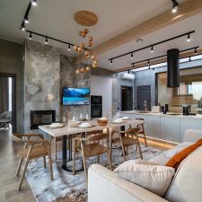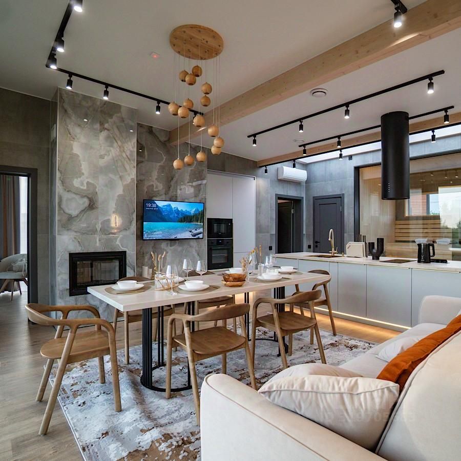 • Просторная гостиная с камином, барной зоной, раскладным диваном и современным Smart-TV